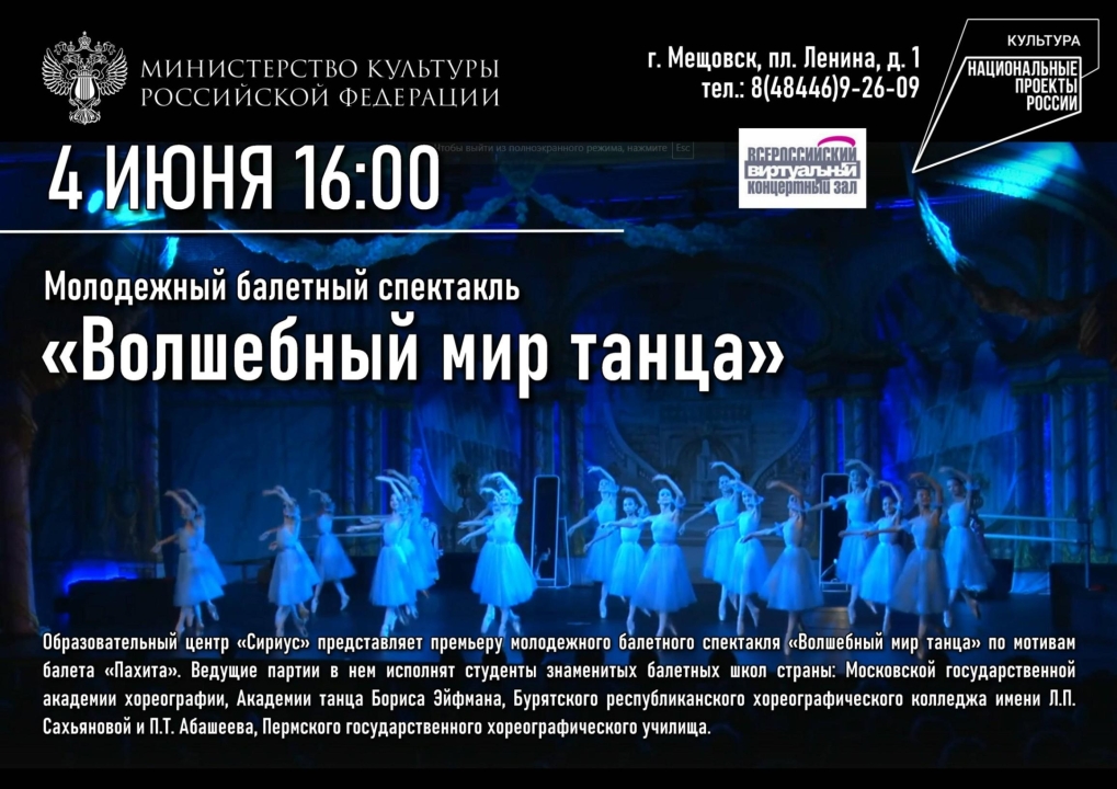 Виртуальный концертный зал Мещовского районного Дом культуры приглашает на просмотр трансляции из Образовательного центра «Сириус», который представит премьеру молодежного балетного спектакля «Волшебный мир танца» по мотивам балета «Пахита». Ведущие партии в нем исполнят студенты знаменитых балетных школ страны: Московской государственной академии хореографии, Академии танца Бориса Эйфмана, Бурятского республиканского хореографического колледжа имени Л.П. Сахьяновой и П.Т. Абашеева, Пермского государственного хореографического училища.