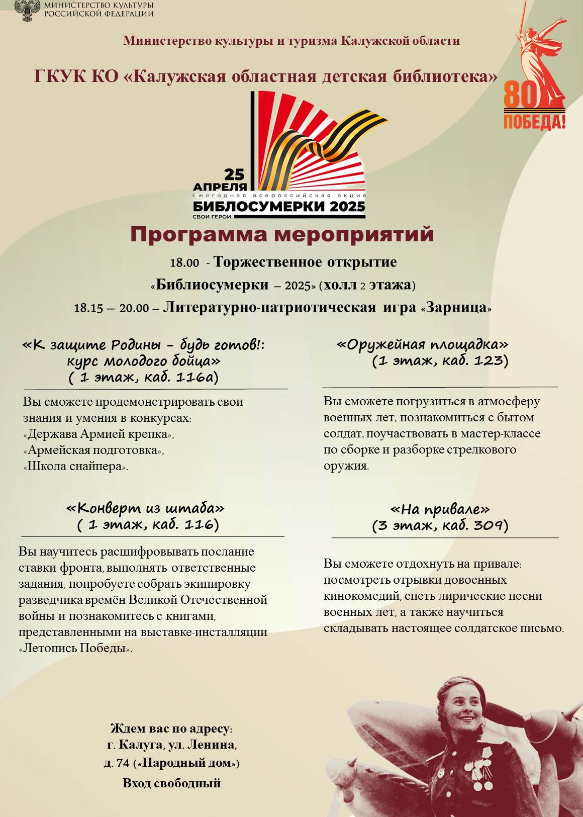 Калужская областная детская библиотека приглашает всех желающих на “Библиосумерки-2025”. Ждём вас по адресу: Ленина, 74 (Народный дом). Начало в 18:00. Вход свободный.