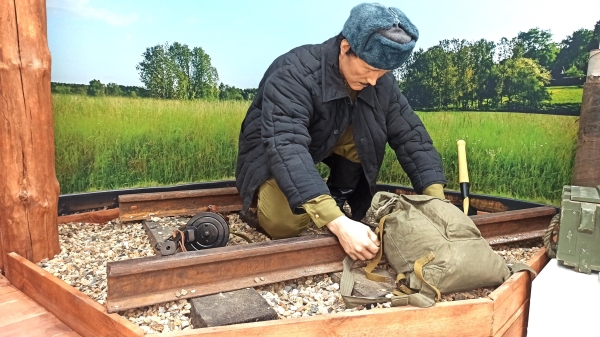 Инсталляция «Партизан минирует железнодорожный путь»: Эта динамичная инсталляция перенесет вас в самый центр событий, демонстрируя отвагу и изобретательность партизан, которые нарушали коммуникации противника, приближая Победу!