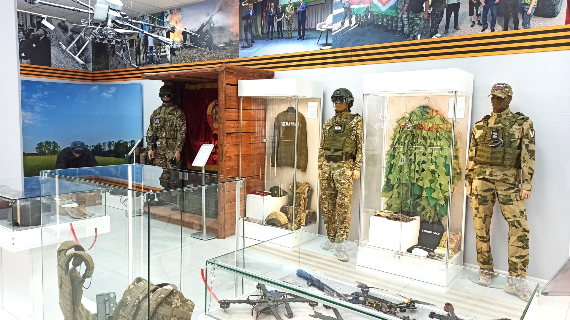 Вторая часть экспозиции посвящена событиям наших дней – Специальной военной операции. Здесь вы сможете ознакомиться с боевыми трофеями, переданными нашими земляками, которые с честью выполняют свой воинский долг – это вражеские разведывательные дроны, оружие, гексакоптер «Баба Яга», экипировка участников СВО и многое другое.