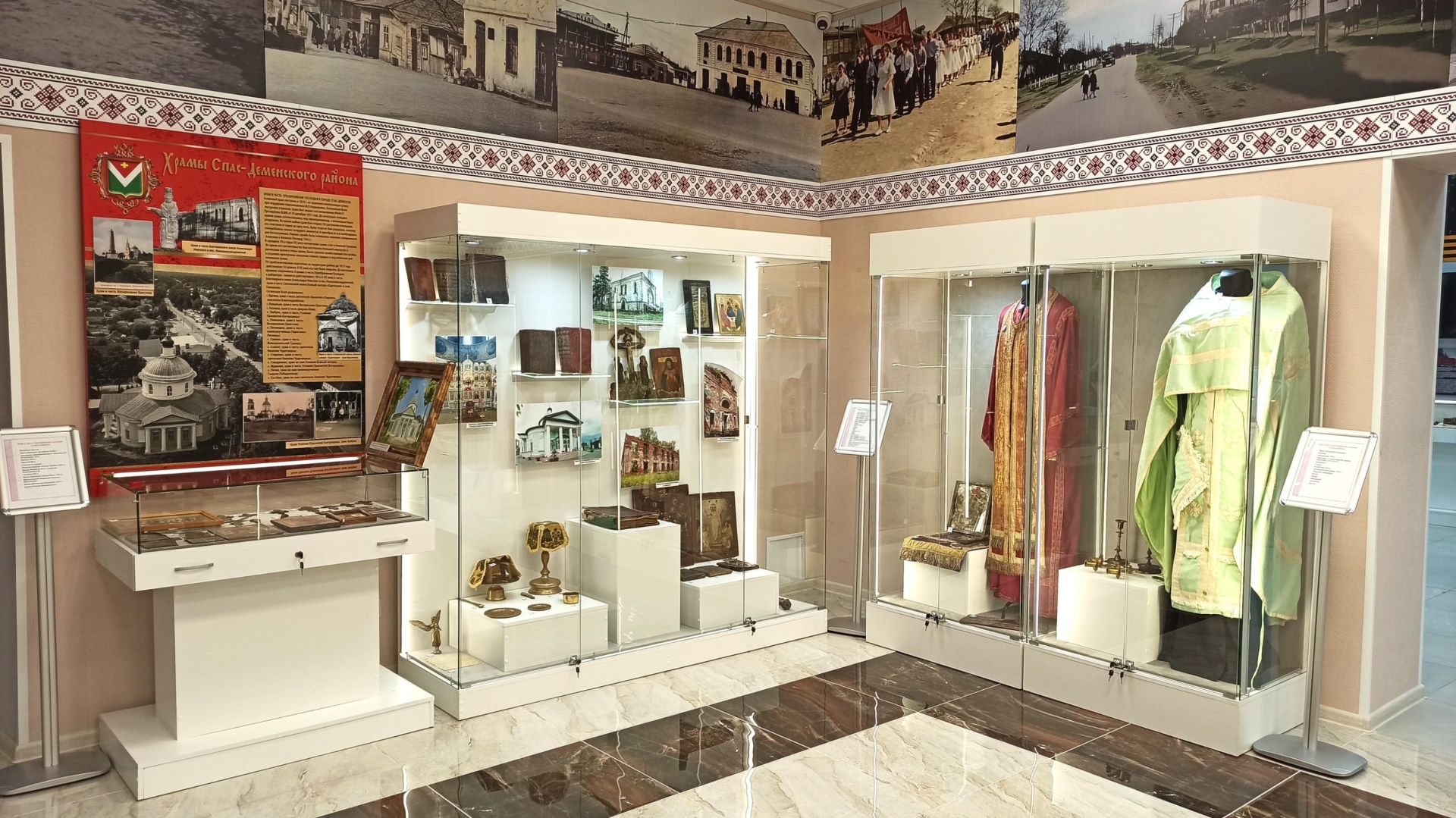 Мы также уделили внимание духовному наследию. В специальном уголке вы узнаете об истории церквей Спас-Деменского района. Здесь собраны облачения священнослужителей, предметы, используемые во время богослужений, старинные книги начала прошлого столетия и старинные иконы, хранящие в себе веру и мастерство предков.