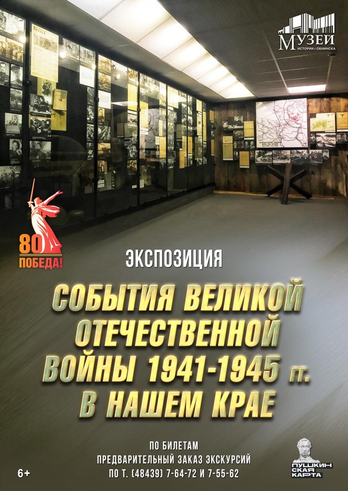 Экспозиция «События Великой Отечественной войны 1941-1945 гг. в нашем крае» посвящена военным судьбам наших земляков, их боевым и трудовым подвигам. Экспонаты помогают проникнуться драматизмом событий, связанных с историей оккупации в 1941 году и последующего освобождения территорий, входивших в состав Малоярославецкого, Угодско-Заводского и Боровского районов.
