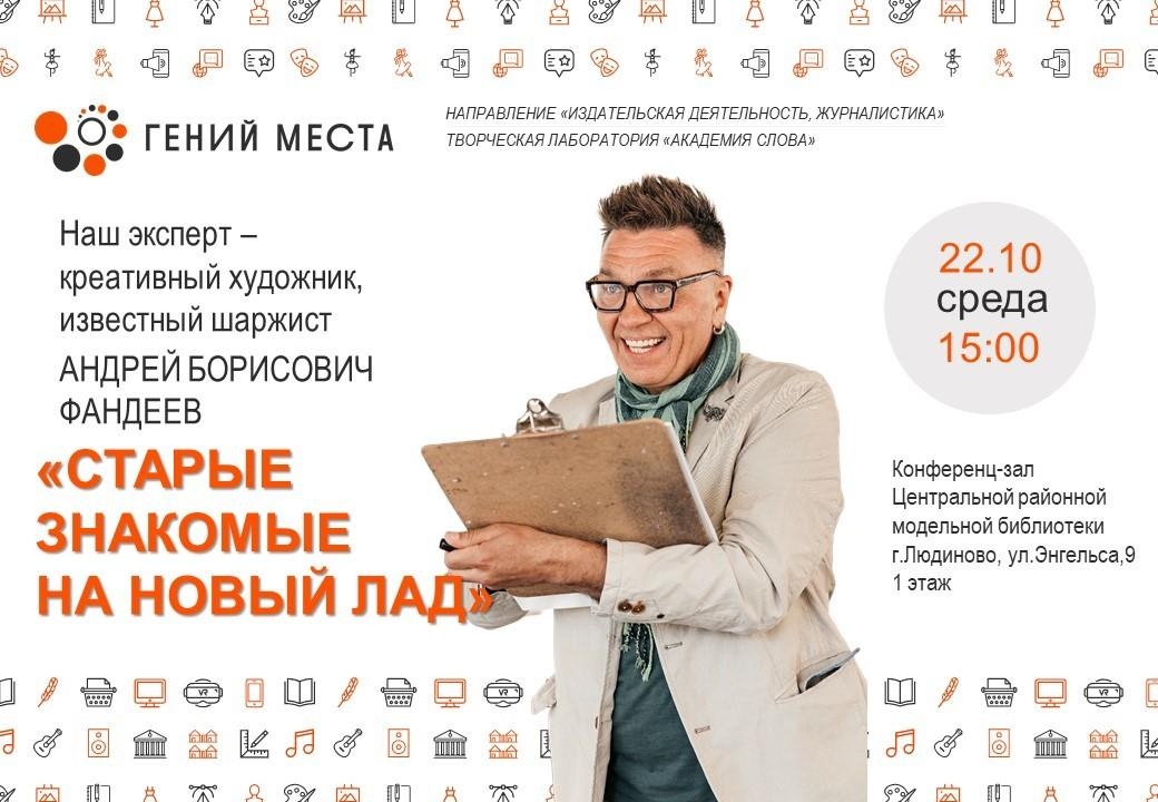 Творческая лаборатория «Академия слова» проекта «Гений места» приглашает слушателей 22 октября в 15.00 в Людиновскую центральную районную библиотеку на встречу с креативным художником, экспертом проекта по художественному творчеству, известным шаржистом Андреем Борисовичем Фандеевым.