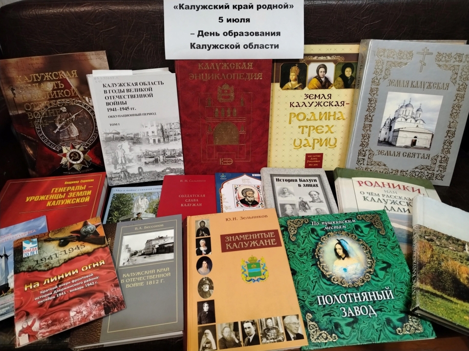 К этому знаменательному событию в библиотеке оформлена выставка книг "Калужский край родной". Здесь представлены книги, рассказывающие об исторических и природных богатствах Калужской земли, о Храмах, о людях, чей подвиг в годы Великой Отечественной войны мы будем помнить и чтить, о знаменитых калужанах, тех, кто строит и приумножает богатства Калужского края.