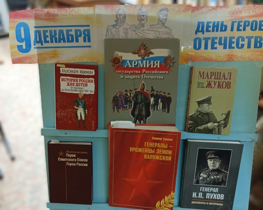 Книжно-иллюстративная выставка «9 декабря - ДЕНЬ ГЕРОЕВ РОССИИ», на которой представлена литература о героях Отечества разных эпох и различных по званию. Их объединяло одно – великая любовь к Родине и способность к её защите. На книжной выставке представлены книги об истории Дня Героев Отчества, о героях России, а также об истории разных войн. Они помогут совершить исторический экскурс в героическое прошлое России, узнать о славных победах российских войск, которые сыграли важную роль в истории Отечества. Представленные на выставке книги посвящены героям, защищавшим Россию от захватчиков из разных стран, в разные времена, в разных войнах: в Великой Отечественной войне 1941-1945 годов, в Отечественной войне 1812 года, в Куликовской битве и других сражениях. Представленные книги рассказывают о героях Отечества, начиная с Александра Невского, Минина и Пожарского, Суворова, до героев 1812 года, героев Великой Отечественной войны.