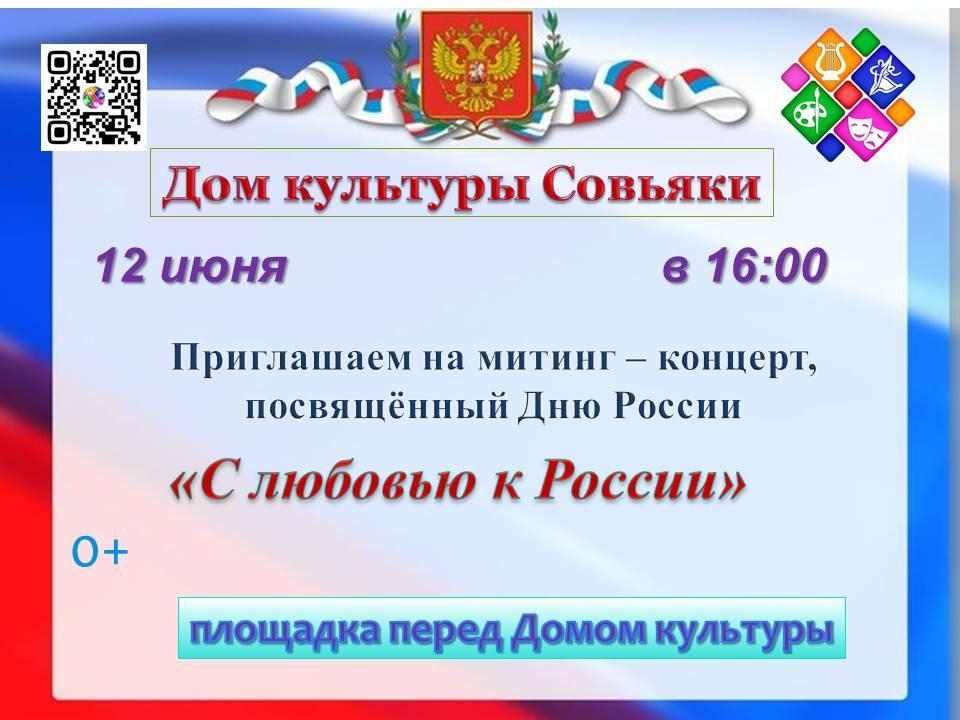 Дорогие друзья! 12 июня состоится празднование Дня России! Приготовьтесь к незабываемому митинг-концерту, наполненному патриотизмом, гордостью за Россию и яркими эмоциями! Вас ждет захватывающий концерт с участием солистов и коллективов Дома культуры, представляющих разные жанры и направления. От народных песен до современных хитов - каждый найдет что-то по душе! Приходите всей семьей, с друзьями и коллегами! Давайте вместе создадим незабываемую атмосферу праздника и продемонстрируем любовь и гордость за Россию!