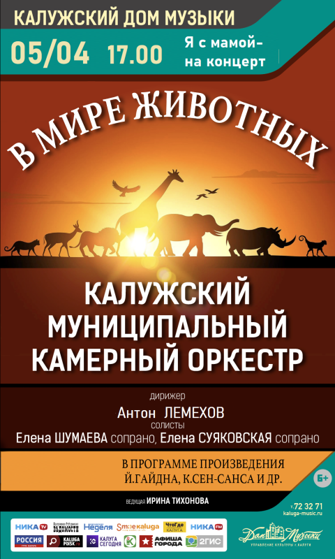 Калужский муниципальный камерный оркестр представляет программу, которая посвящена "братьям нашим меньшим" - самым разным животным, образы которых композиторы воплотили в музыке. На неё приглашаются как взрослые слушатели, так и совсем юные. В исполнении оркестра прозвучат яркие и характерные произведения: симфония Й.Гайдна "Курица", вокальные пьесы Г.Форе и Д.Россини. Центром программы стал знаменитый "Карнавал животных" К.Сен - Санса. Музыка удивительно выразительная, понятная, в ней множество изобразительных моментов и юмора.