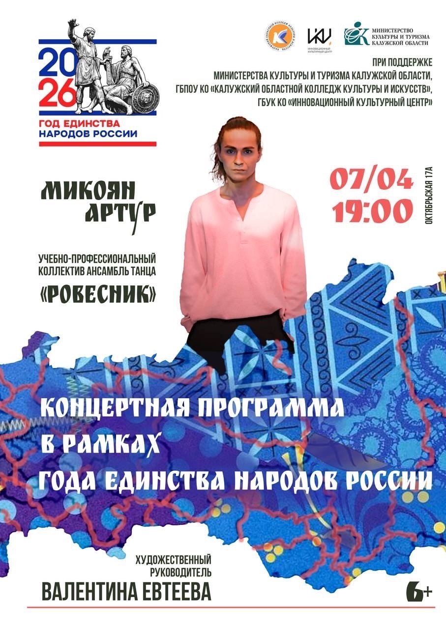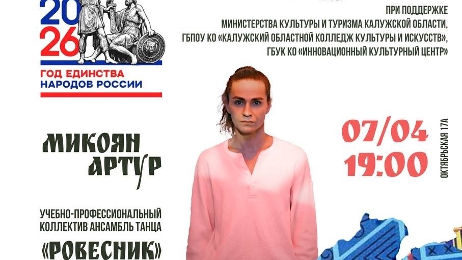 7 апреля в 19:00 ИКЦ приглашает на концерт, который объединит традиции, культуру и сердца зрителей. В программе принимают участие Заслуженный артист Калужской области Артур Микоян и учебно-профессиональный коллектив ансамбль танца «Ровесник» Калужского областного колледжа культуры и искусств.
