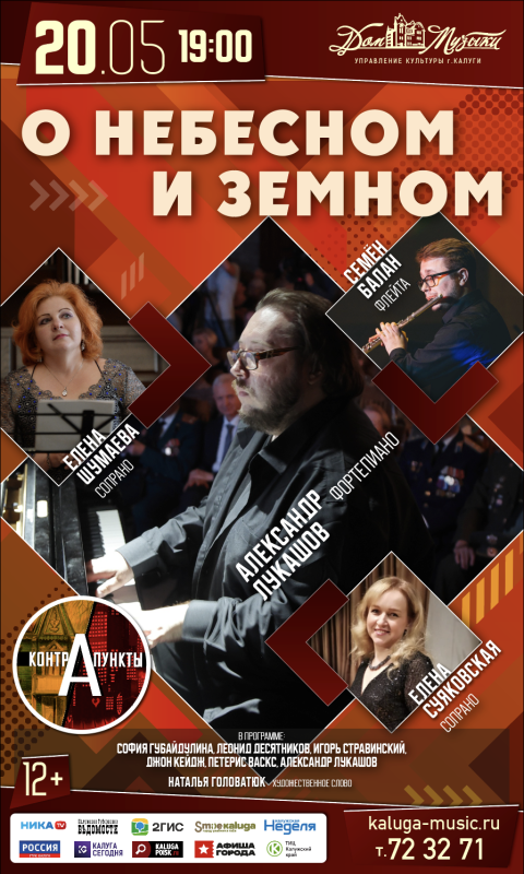 Артисты Калужского Дома музыки и автор программы Александр Лукашов представят камерные инструментальные и вокальные сочинения композиторов 20-21 вв. Прозвучит музыка Софии Губайдулиной, Бориса Чайковского, Джона Кейджа, Джачинто Шельси, Дэвида Лэнга, а также сочинения Александра Лукашова. Ведущая вечера - Наталья Головатюк.
