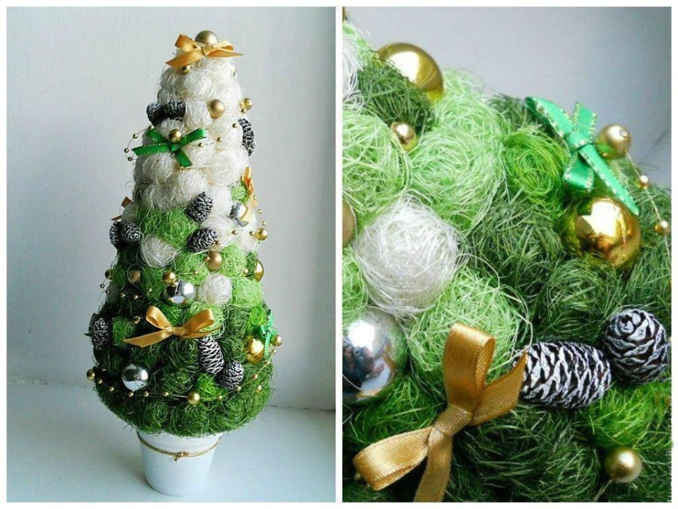 Из сизаля можно изготовить ёлочку — декоративное изделие, которое подойдёт для новогоднего интерьера или подарка.