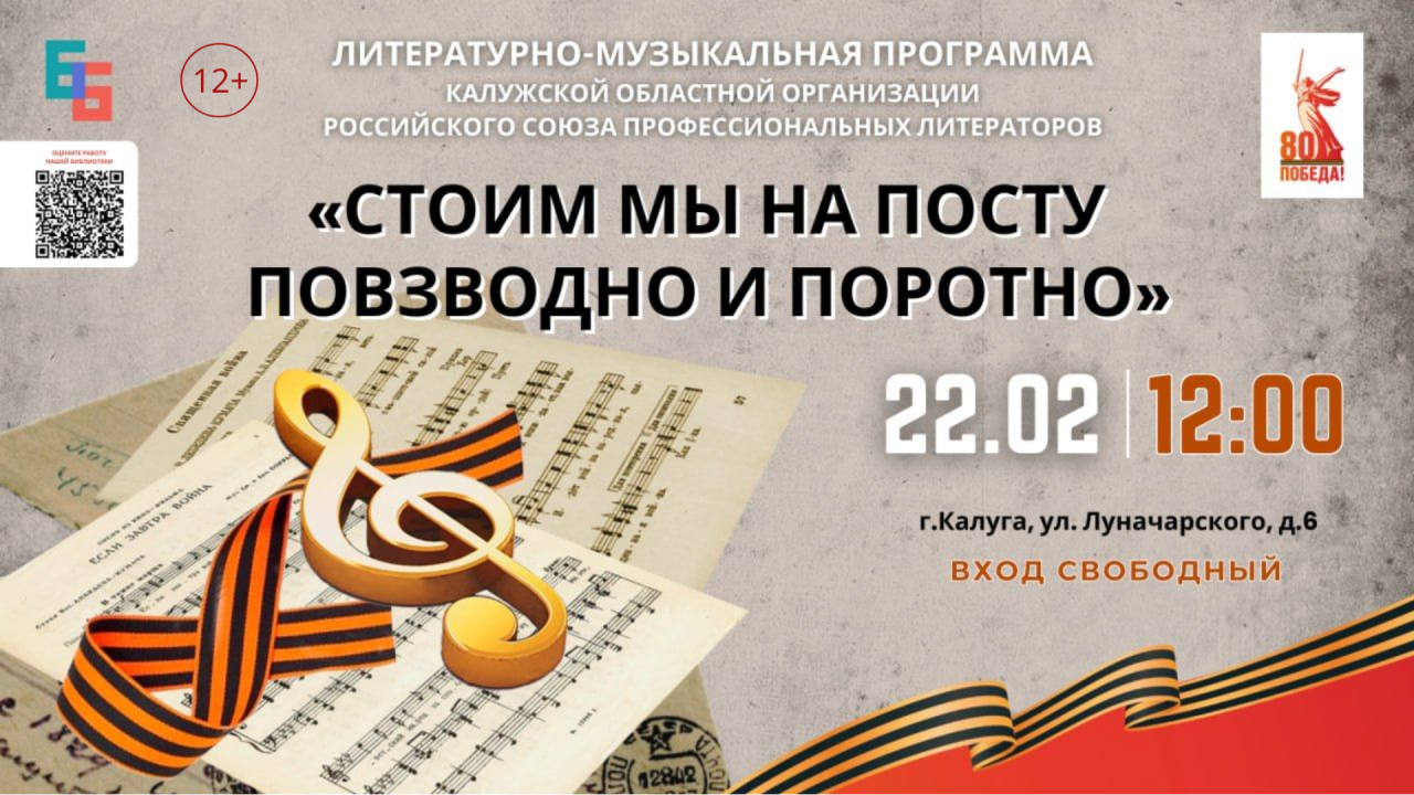 22 февраля творческий коллектив Калужской областной организации Российского союза профессиональных литераторов представят музыкально-поэтическую программу «Стоим мы на посту повзводно и поротно», посвящённая Дню защитника Отечества.
