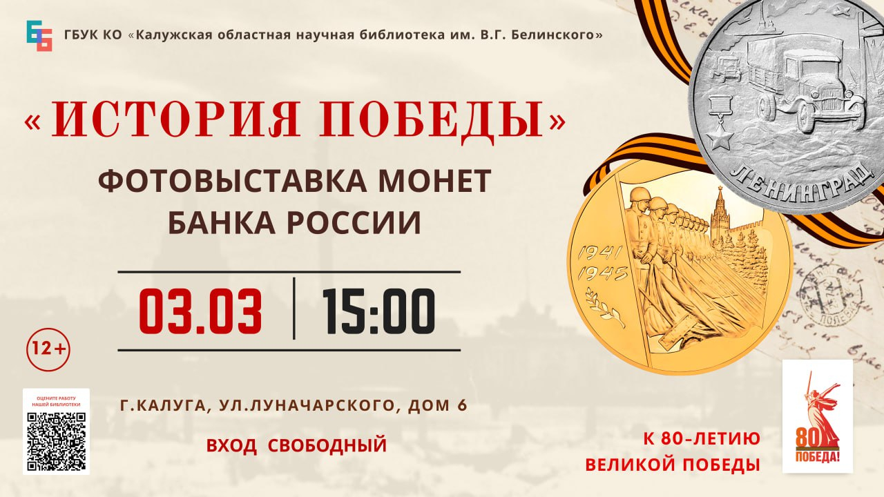 03.03.2025 г. в 15:00 в нашей библиотеке пройдет открытие выставки «Истории Победы»: фотовыставка монет Банка России.