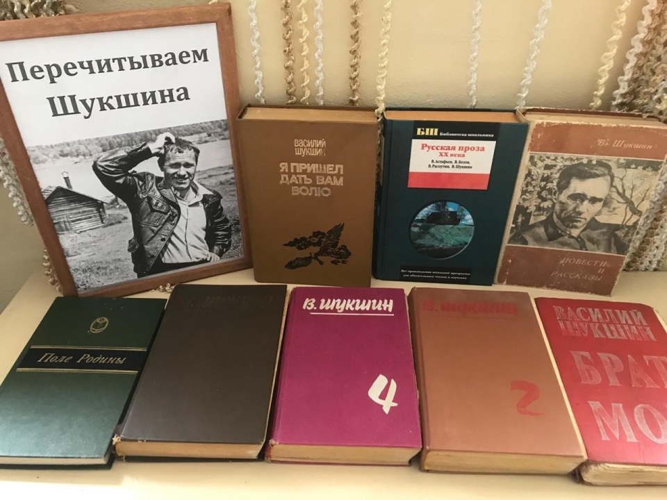 На книжной выставке, посвящённой Василию Шукшину, посетители библиотеки смогут ознакомиться с его произведениями, сборниками рассказов разных лет.