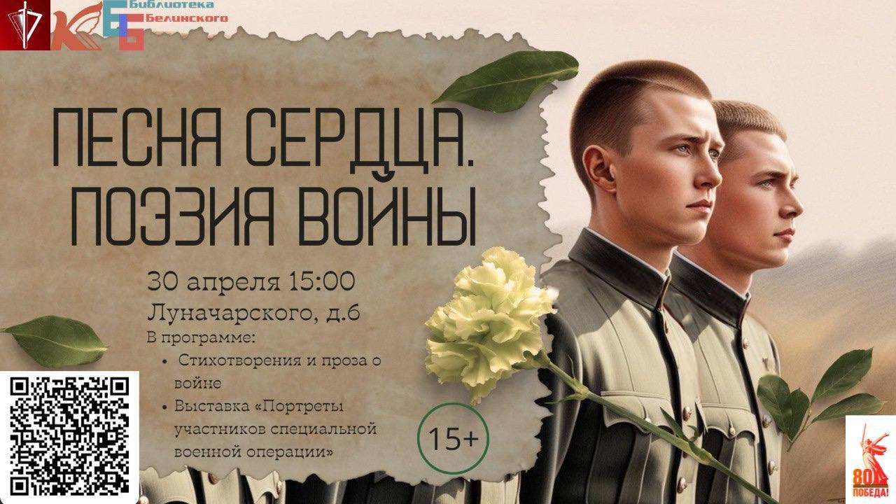 30 апреля в 15:00 в библиотеке им. В.Г. Белинского состоится яркое мероприятие под названием «Песня сердца. Поэзия войны», посвященное 80-летию Победы в Великой Отечественной Войне.
