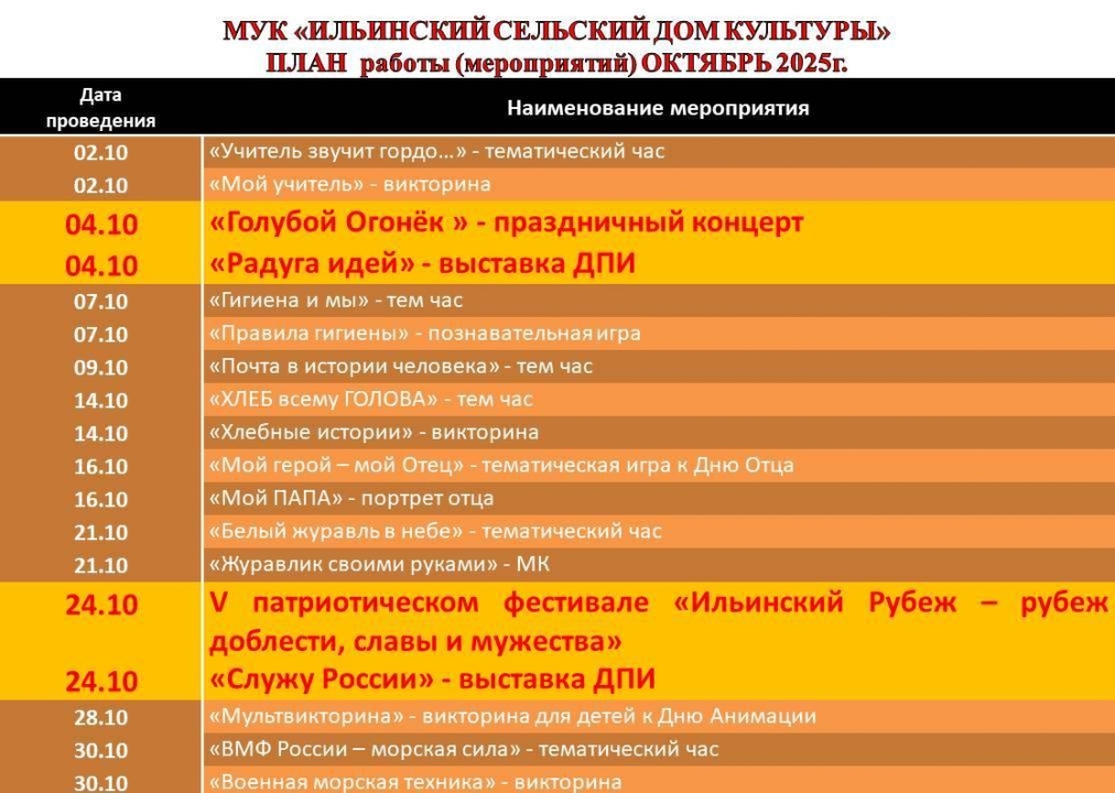 План мероприятий МУК Ильинский сельский Дом культуры на октябрь месяц 2025 года. в плане представлены игровые программы, концерты художественной самодеятельности, детские дискотеки и тематические часы.