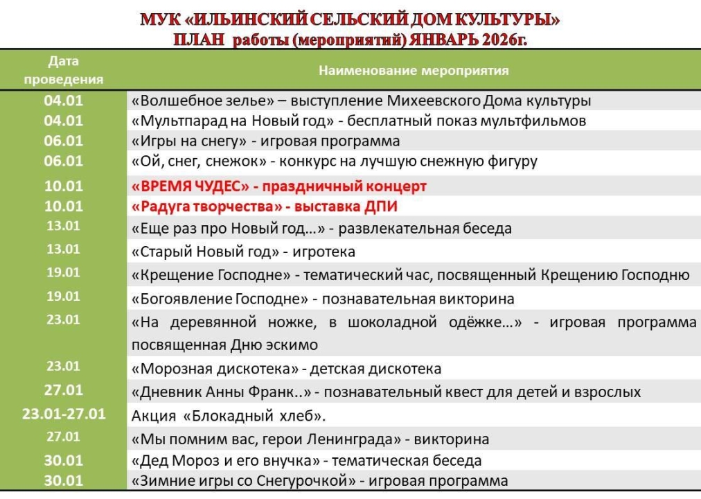 План мероприятий МУК Ильинский сельский Дом культуры на январь 2026 года. в плане представлены игровые программы, концерты художественной самодеятельности, детские дискотеки и тематические часы.