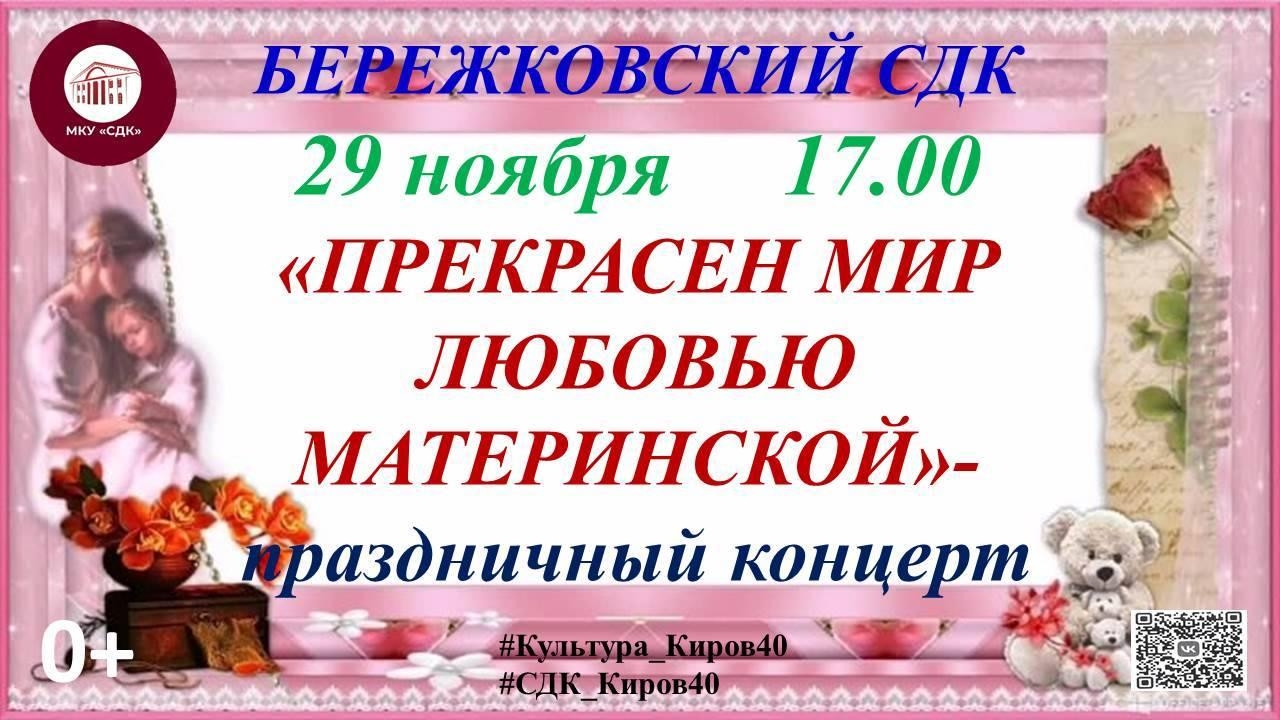 В последнее воскресенье ноября, вся Россия отмечает прекрасный праздник – День матери. Праздничная концертная программа состоится в Бережковском СДК. Мероприятие будет ярким, интересным и разнообразным. На протяжении всего праздника будут звучать слова благодарности, восхищения, уважения и любви в адрес мам. С особой теплотой и любовью прозвучат хорошие, добрые, веселые песни в исполнении солистов художественной самодеятельности. С нежными и трогательными песнями о маме выступят дети. Участники творческой мастерской «Затейники» поздравят всех мам открытками, которые сделали своими руками. Совместными усилиями создадим теплую атмосферу праздника и подарим зрителям хорошее настроение.