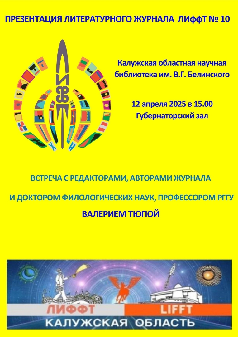 Литературный журнал «ЛИффТ» Калужской области существует с 2016 года, за это время в нем были опубликованы работы 134-х наших областных авторов (в том числе поэтов-фронтовиков), а также подборки современных признанных мастеров слова.