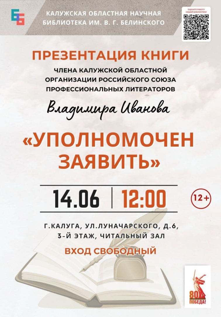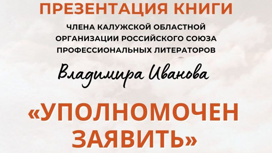 На презентации будет представлена книга подполковника в отставке, бывшего начальника штаба Поста №1, члена Калужской областной организации Российского союза профессиональных литераторов Владимира Иванова «Уполномочен заявить».