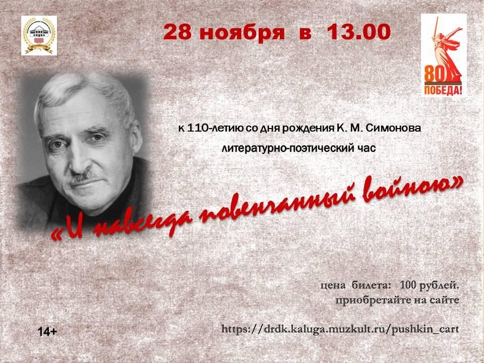 В рамках празднования 110-летия со дня рождения Константина Михайловича Симонова, выдающегося поэта, прозаика, драматурга, военного корреспондента и общественного деятеля, для молодого поколения пройдет литературно-поэтический час.