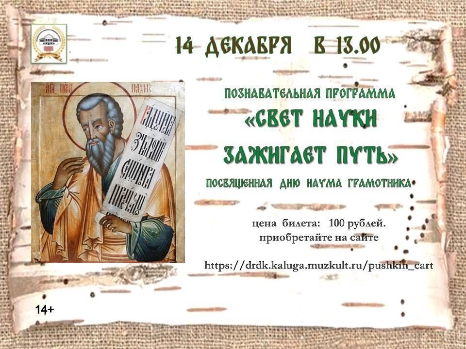 В честь Дня Наума Грамотника, небесного покровителя грамотности и просвещения для молодого поколения, состоится познавательная программа. Мероприятие предоставит уникальную возможность погрузиться в мир русской словесности и ознакомиться с интересными фактами из жизни выдающегося книжника.