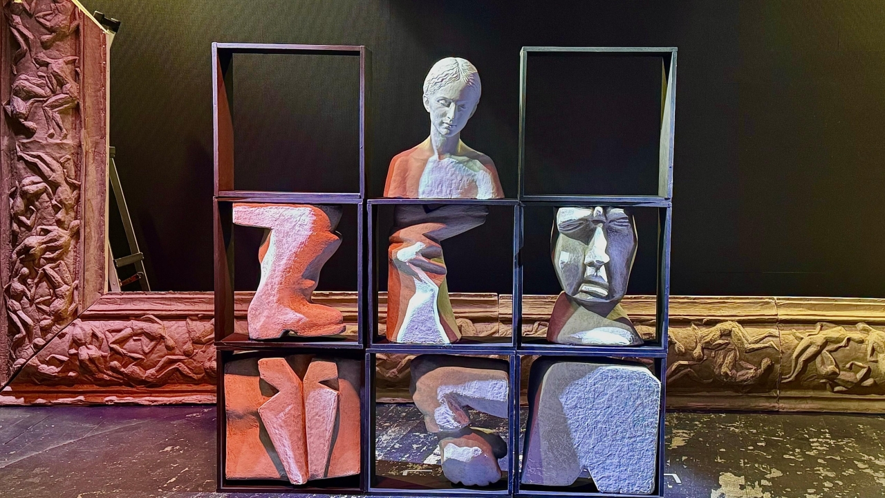 Куклы в спектакле похожи на скульптуру, персонажи костенеют, перетекают, усыхают, но всеми силами безуспешно пытаются сохранить человеческий облик.