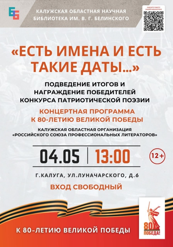 4 мая в стенах нашей библиотеки состоится торжественное награждение победителей 19-го Международного конкурса патриотической поэзии им. А.Т. Твардовского и праздничная музыкально-поэтическая программа, посвящённая 80-летию Великой Победы.