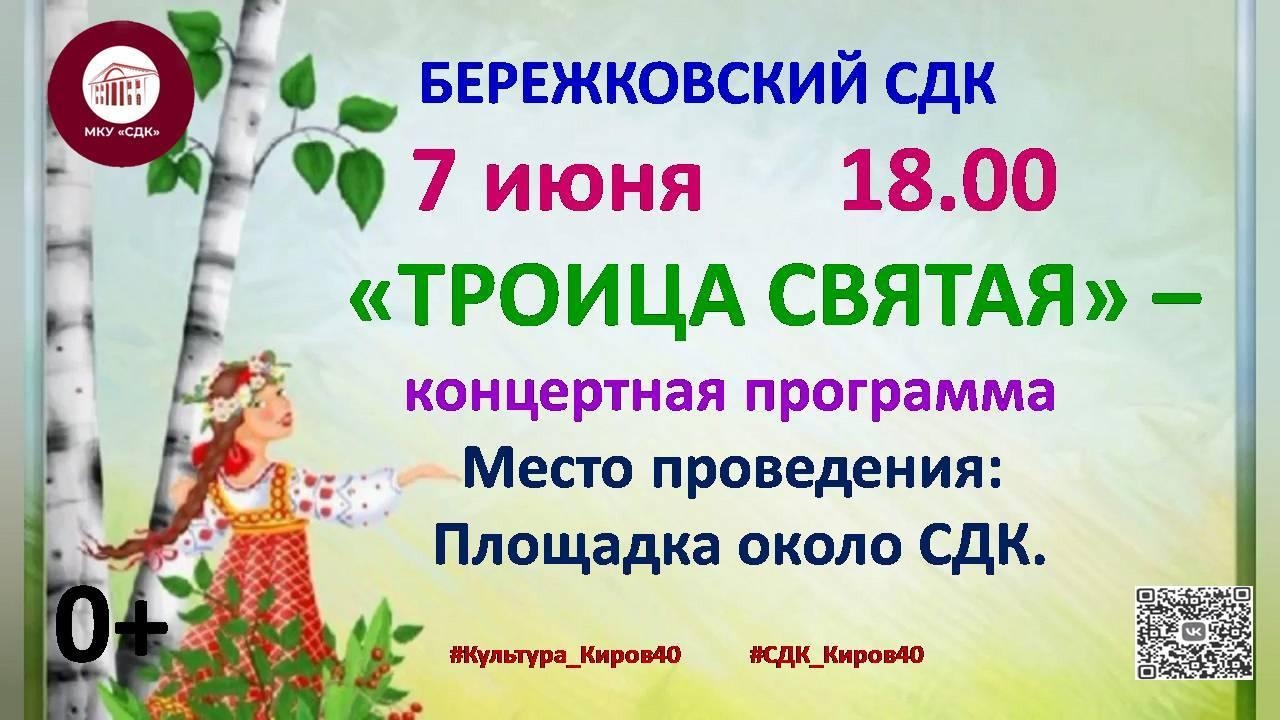 Троица – важный православный праздник, который очень любят и уважают верующие люди. С этим праздником связано очень много традиций и обычаев, которые можно и нужно чтить. Праздник Троица – это праздник жизни и природы. 7 июня в Бережковском СДК пройдет концертная программа, посвященная Троице. Зрители узнают много интересного о праздновании Троицы, о народных традициях, примут участие в народных играх и троичных обрядах, будут отвечать на вопросы викторины. Музыкальные подарки прозвучат в исполнении солистов ДК. Присутствующие смогут повеселиться, насладиться общением и провести время в кругу друзей.