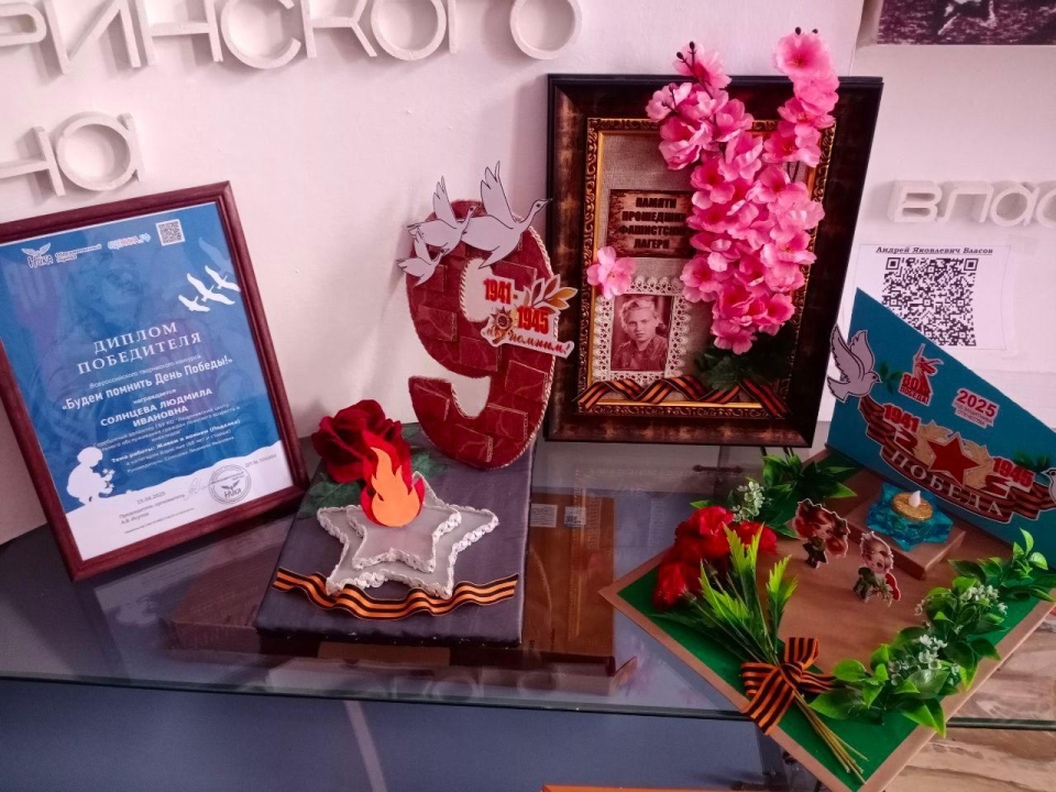 В победный месяц май Жиздринский музей проводит для жиздринцев и гостей города выставку, на которой представлены творческие работы (поделки) жительницы нашего города Людмилы Ивановны Солнцевой, ставшей победителем Всероссийского творческого конкурса "Будем помнить День Победы!" в категории "Взрослые (60 лет и старше)".