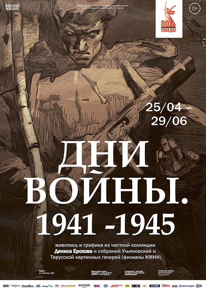 В очередной, уже 80-й юбилей Великой Победы Калужский музей изобразительных искусств представляет вниманию зрителей выставку «Дни войны. 1941-1945», тем самым присоединяясь ко всеобщему празднику освобождения нашей Родины от немецко-фашистских захватчиков, выражая искреннюю благодарность и признательность нашим героическим предкам.