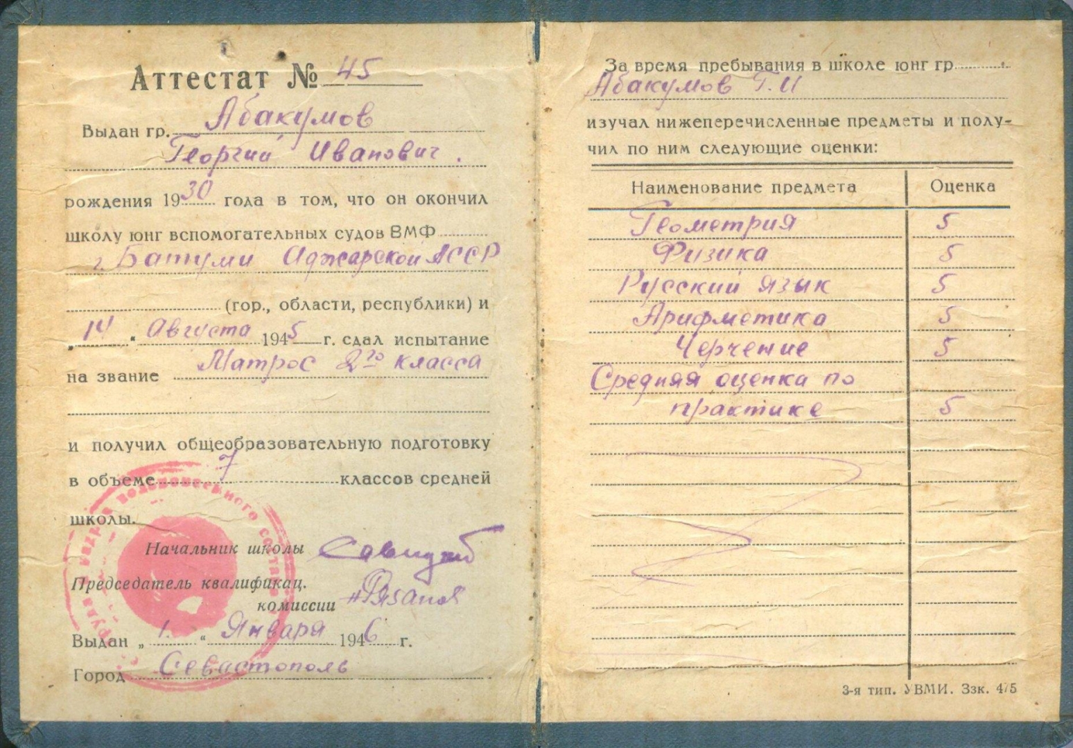 На выставке представлены документы, фотографии, личные вещи, материалы, раскрывающие страницы биографии Георгия Абакумова: аттестат матроса 2-го класса, пригласительный билет на Парад Победы 9 мая 2025 г., фото военных лет.