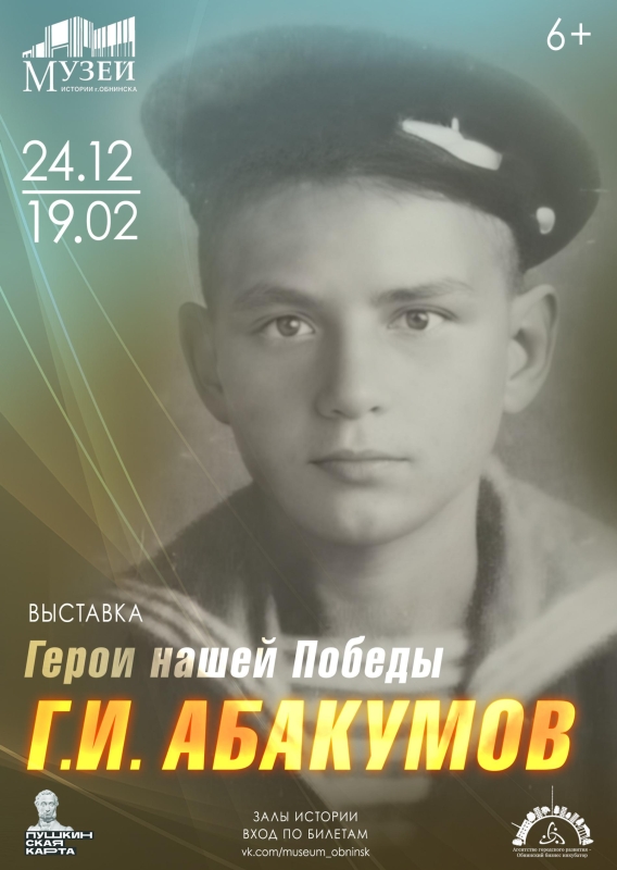 Выставка «Герои нашей Победы. Г.И. Абакумов» развернута в сменных витринах в разделе «События Великой Отечественной войны» и посвящена ветерану Великой Отечественной войны, ставшему в 13 лет юнгой Черноморского флота.
