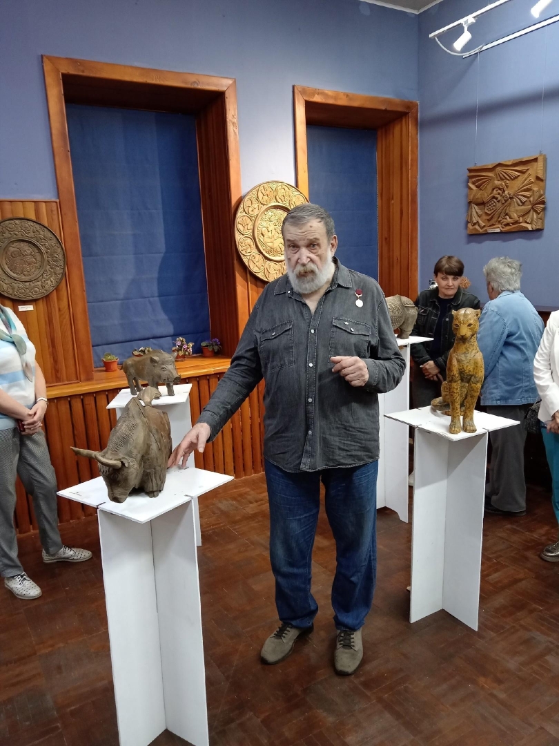 На выставке представлены анималистические скульптуры, декоративные рельефы, блюда и другие работы. Евгений Столяров занимает свое особое место в пространстве калужского изобразительного искусства. 57 лет он работает в области «художественного дерева», любимые темы – анималистика, космос, декоративные рельефы. Художник органично чувствует материал, с которым работает, мастерски соединяет резной декор с формой предмета. Евгений Столяров в своем творчестве следует за природой, но не копирует ее. В анималистических скульптурах ему удается показать обобщенную идею, характер того или иного животного: мощь и упрямство носорога, опасную грацию леопарда, природную красоту и пластику пантеры. Также Евгений Петрович работает в области храмового искусства. Им, совместно с другими художниками, был выполнен великолепный деревянный киот иконы Калужской Богоматери, сень над иконой Троицы в Свято-Троицком кафедральном соборе г. Калуги.