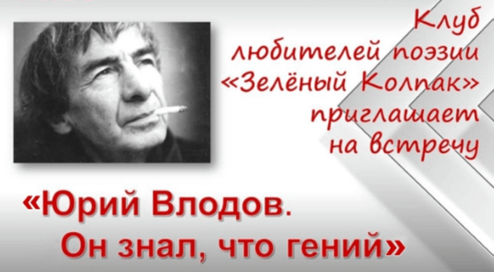 Клуб любителей поэзии «Зелёный Колпак» собирает друзей! Тема очередного заседания «Юрий Влодов. Он знал, что гений»