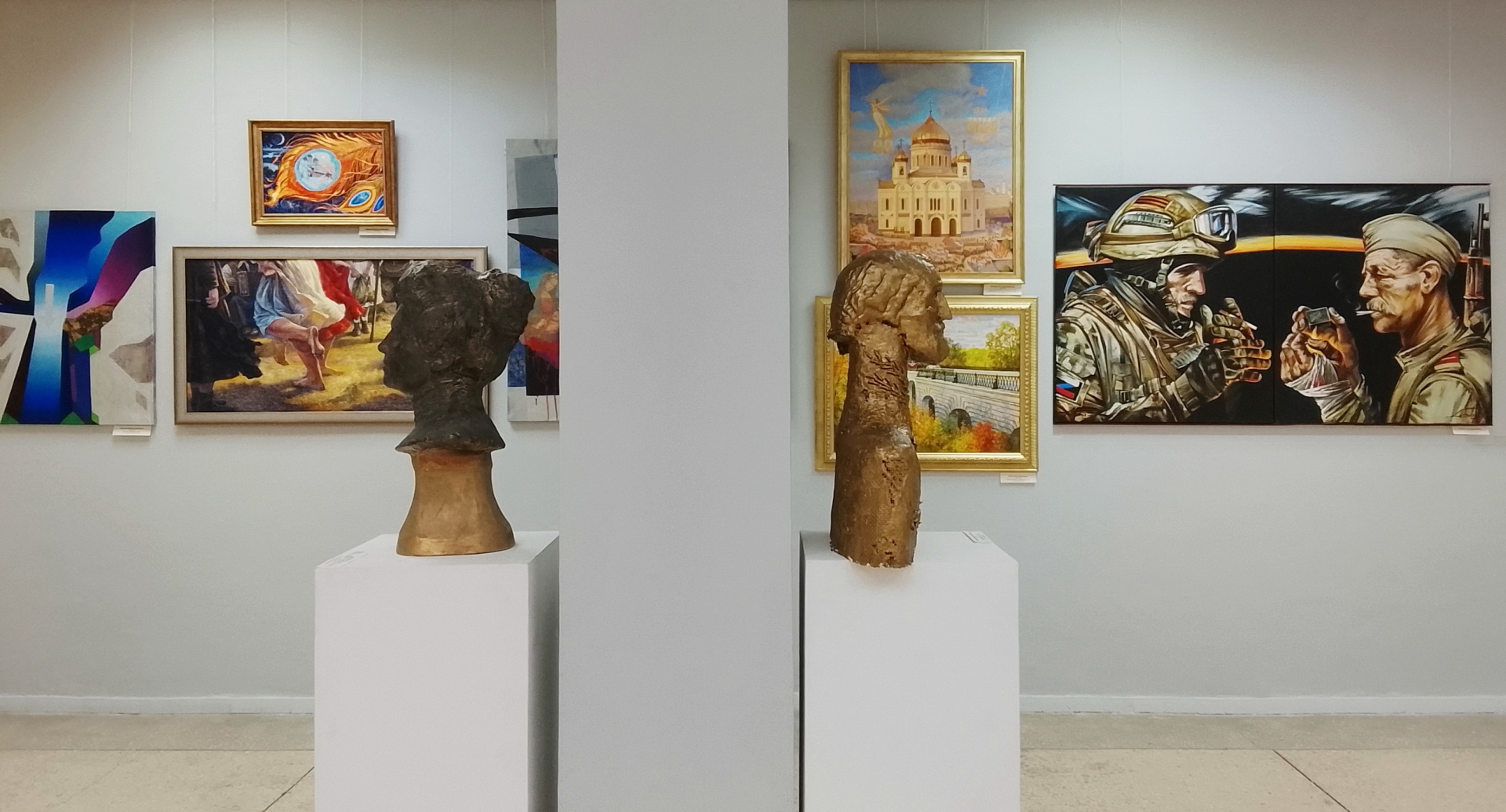 Актуальную во все времена тему служения Отечеству и личной самоотверженности, преемственности поколений, поднимают в своих работах Алексей Базанов в картине «Закурим батя» и Владимир Киреев в картине «Единственный». Скульптор Светлана Фарниева представила портреты участников Специальной военной операции. Библейская тематика нашла свое отражение в работах скульптора Владимира Драгана – резных барельефах «Бегство в Египет» и «Снятие с креста», выполненных по мотивам офортов 16-го и 19-го веков.