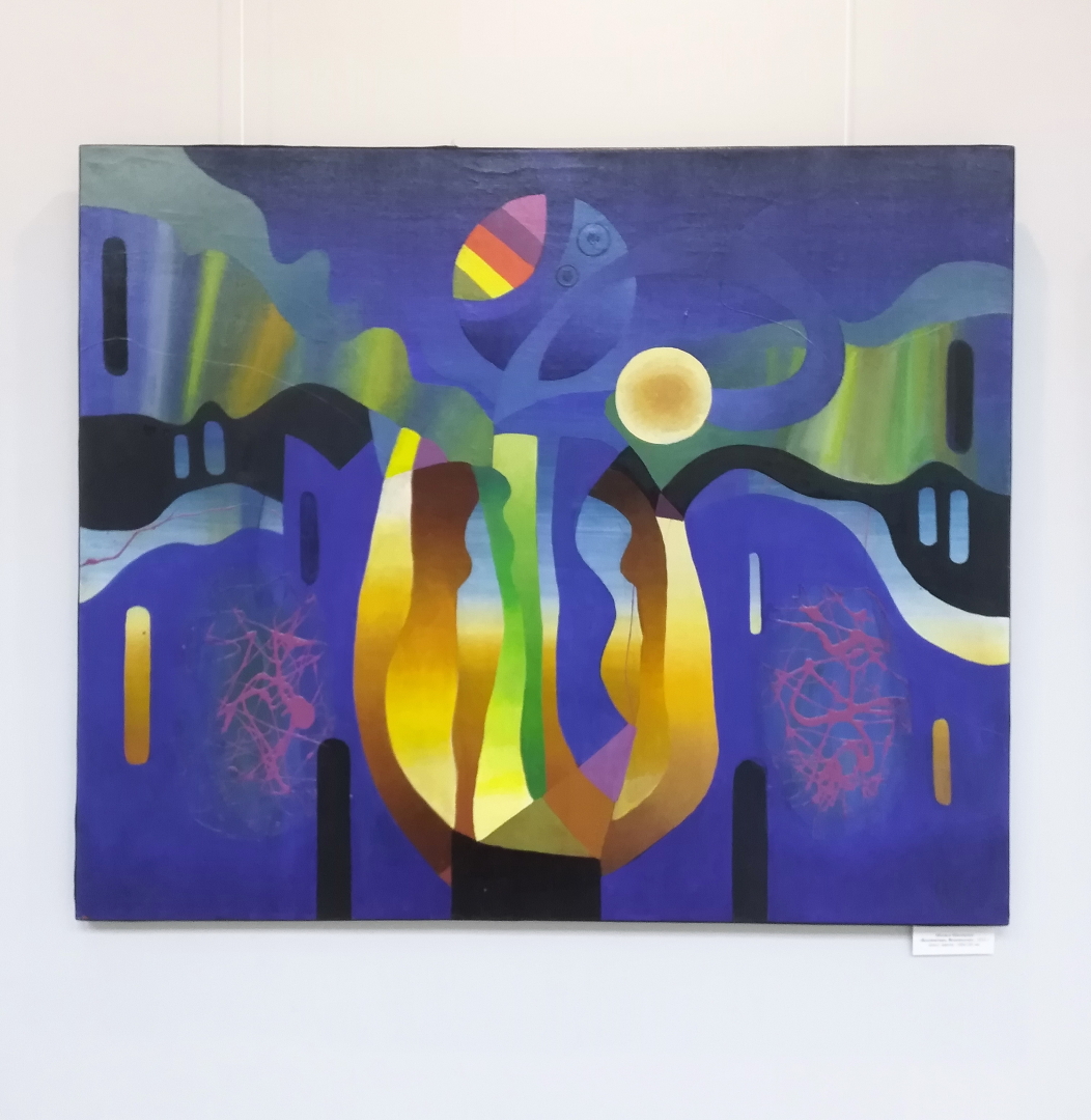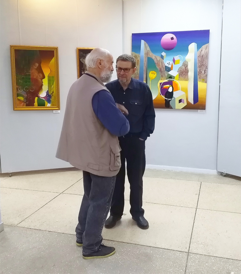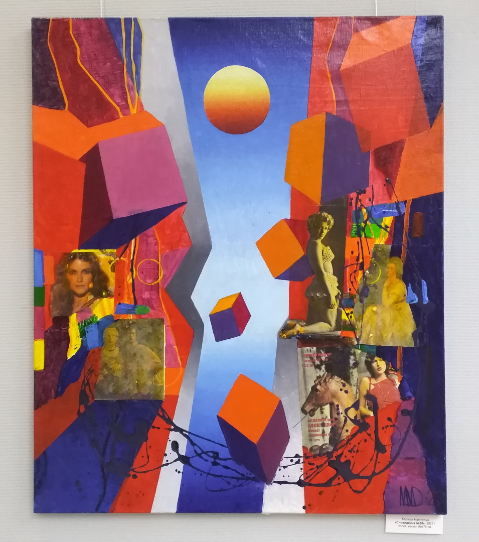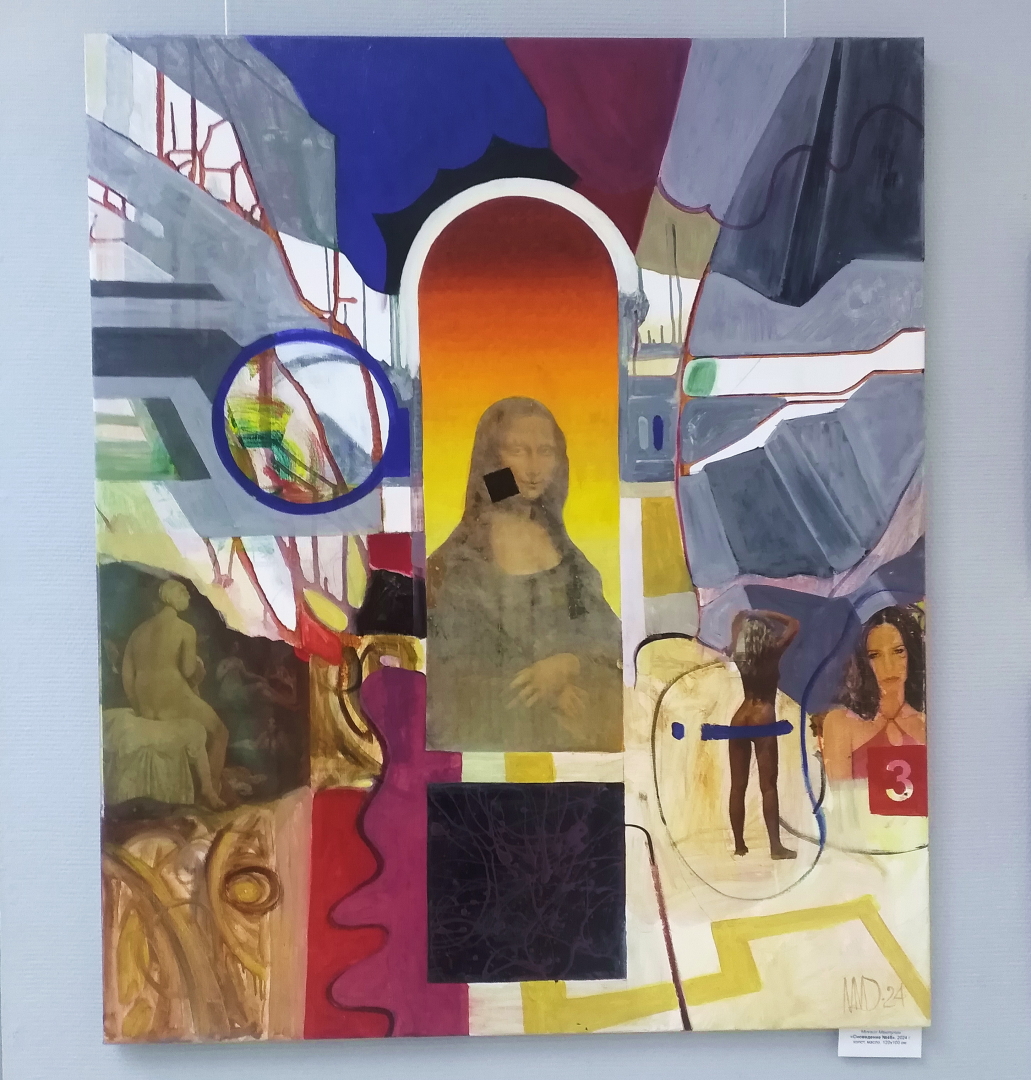 В картинах, над многослойной структурой композиции, часто присутствует мотив восходящей или заходящей, переливающейся мягким светом планеты. И эта планета - точка отсчета бытия, символ рождения времени, пространства и материи. Планета в картинах художника «держит» поле картины, структурирует его. Часто художник конструирует свою Вселенную, включая в сложные композиции образы Эпохи Возрождения, фрагменты жанровых картин прошлых столетий. Легко, как в полете, отталкиваясь от материальности мира, художник углубляется в работу с формой, пятном, абстрактной композицией, вновь возвращается к классическим образам. Например, в картине «Сновидение №45», представленной на выставке, центром композиции становятся два знаковых образа: «Джоконда» Леонардо да Винчи и «Черный квадрат» Казимира Малевича. Это не спор и не противопоставление - это тождество значимых, вписанных в историю искусства символов, двух наивысших точек развития искусства.