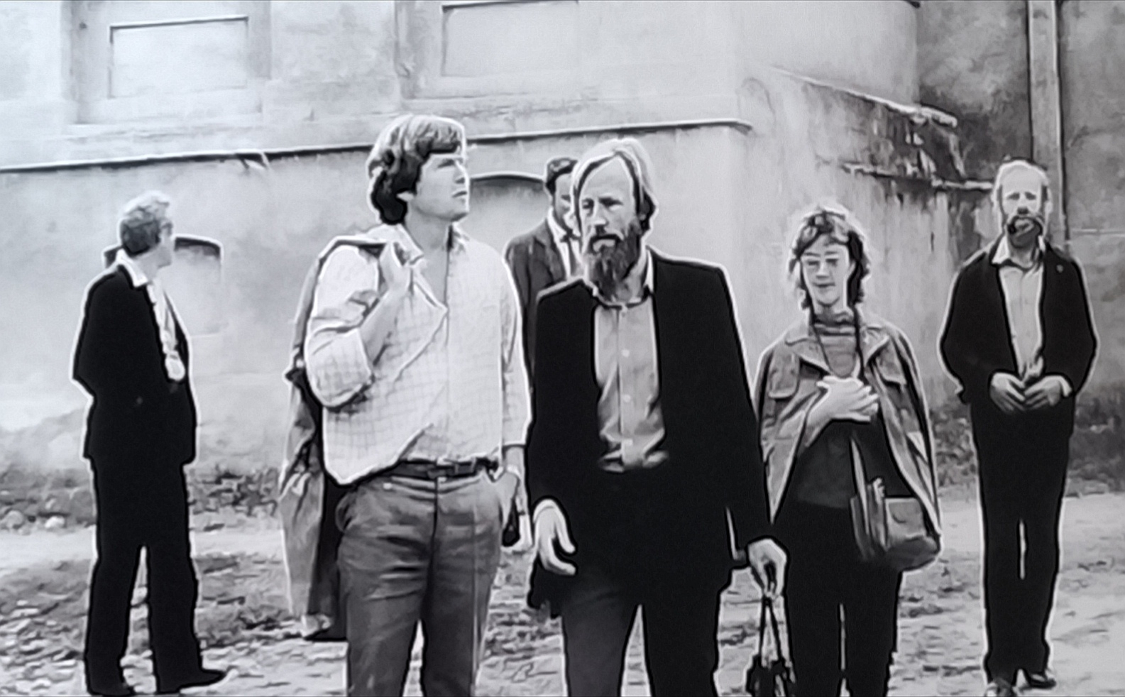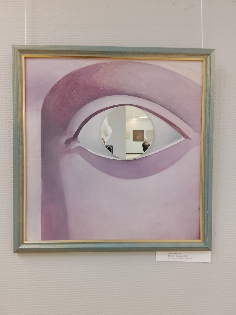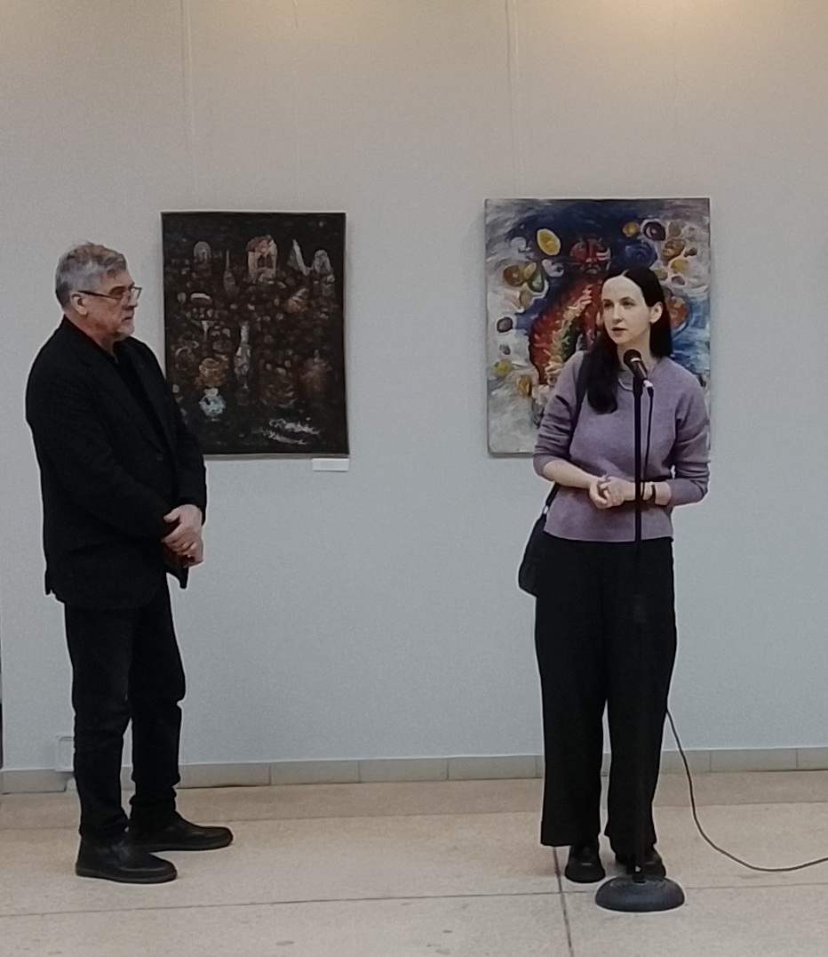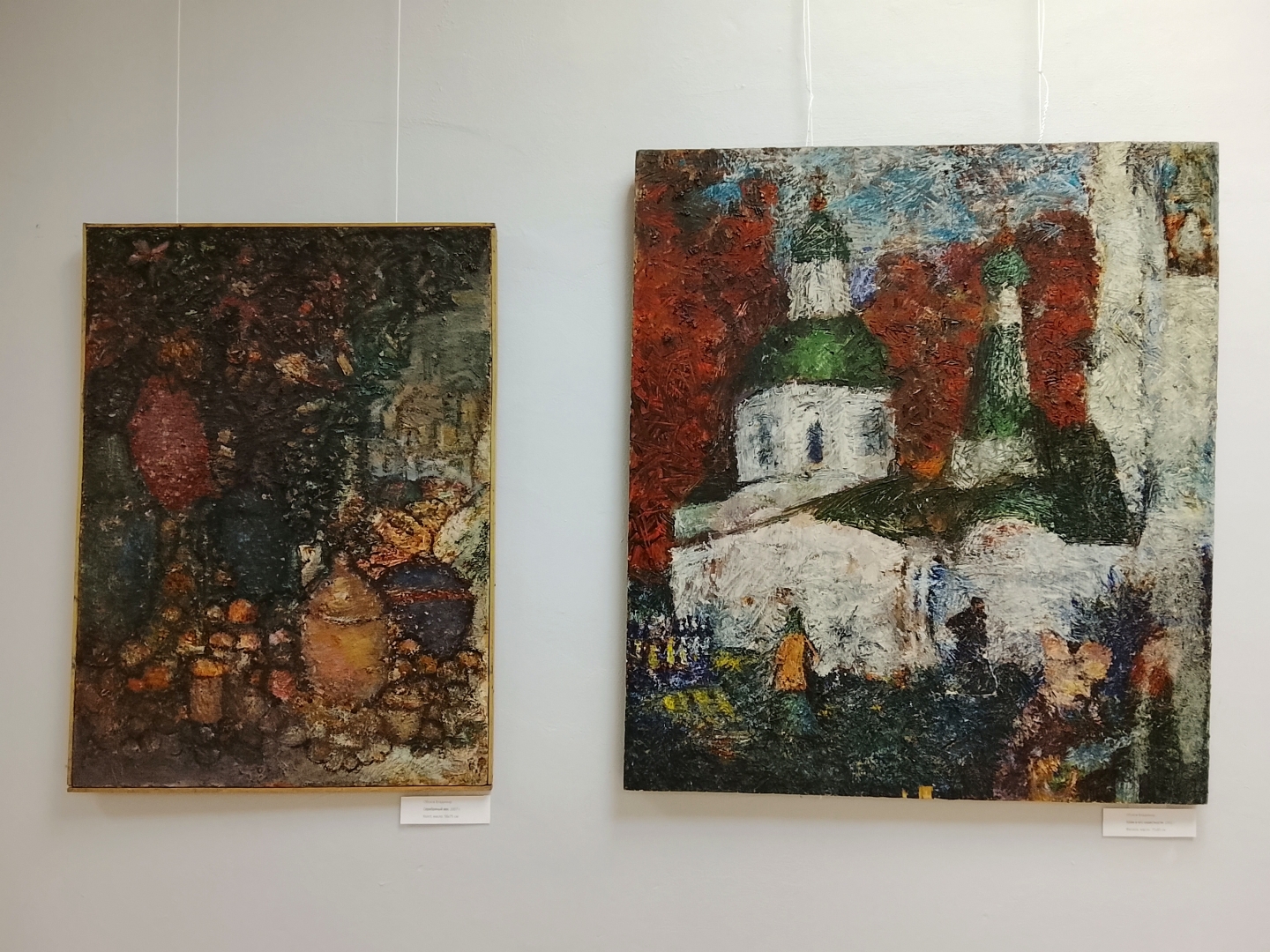 «Здесь я вижу много друзей. У папы было много друзей, гораздо больше здесь присутствующих… Еще какое-то время он увлекался, благодаря дружбе с замечательным тоже калужским художником Петром Петровичем Козьминым - его стиль, даже не стиль, а техника – глассография. И здесь тоже одна небольшая работа представлена - живопись на стекле, напоминает немножко работы П.П. Козьмина и в большей части здесь представленных работ – это 1990-е в основном годы. У них была очень интересная история, потому что папа увлекся очень активно живописью после смерти моего дедушки, художника Ивана Захаровича Пушкарева, и у него осталось много холстов, соответственно каких-то еще старых масляных красок, и надо было все это использовать, и тогда это вдохновило папу. Этот факт вдохновил папу на создание всех шедевров, которые в основном здесь видим у него, все большие работы того времени».